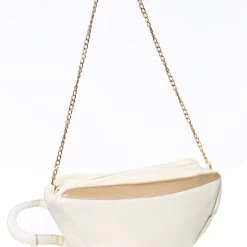 - Hard, round bag has an attached chain strap