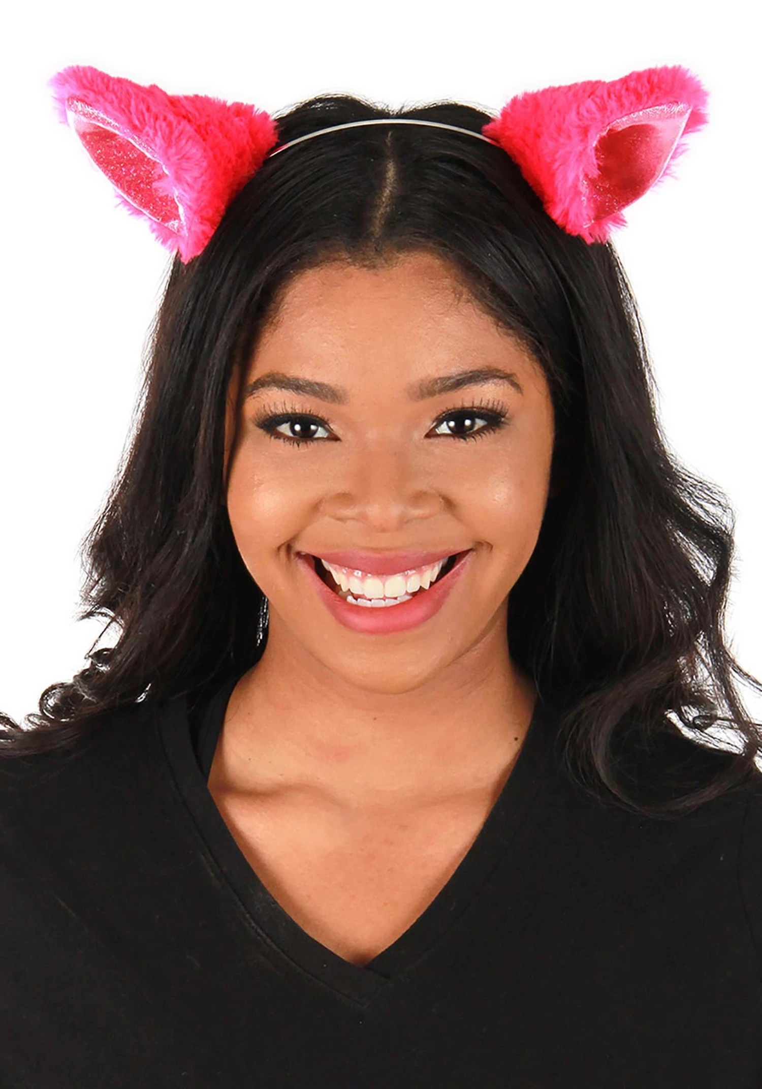 - Neon-bright magenta faux fur covers foam ears, lined w/ metallic knit