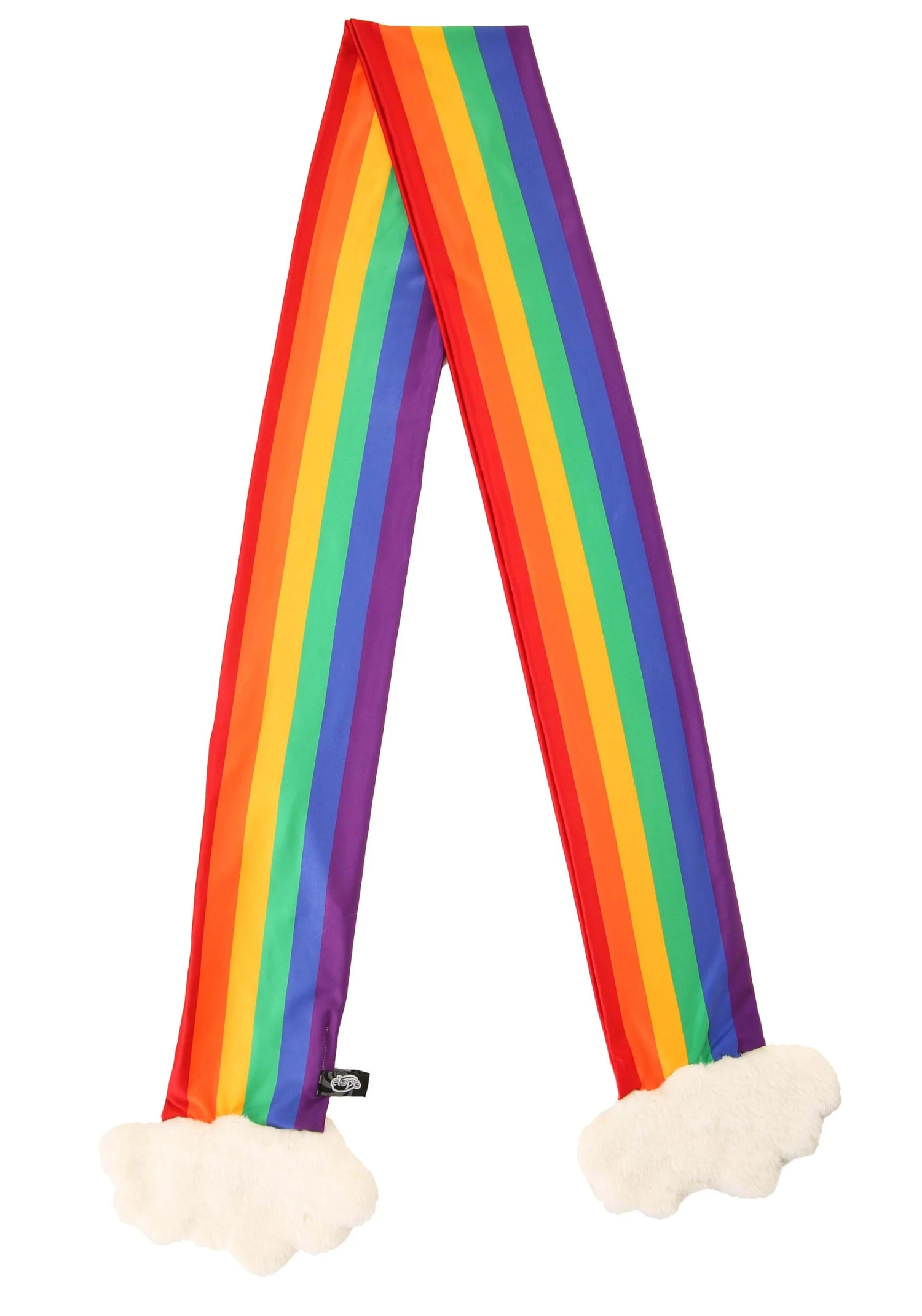 - Rainbow print scarf has a white faux fur “cloud” at each end