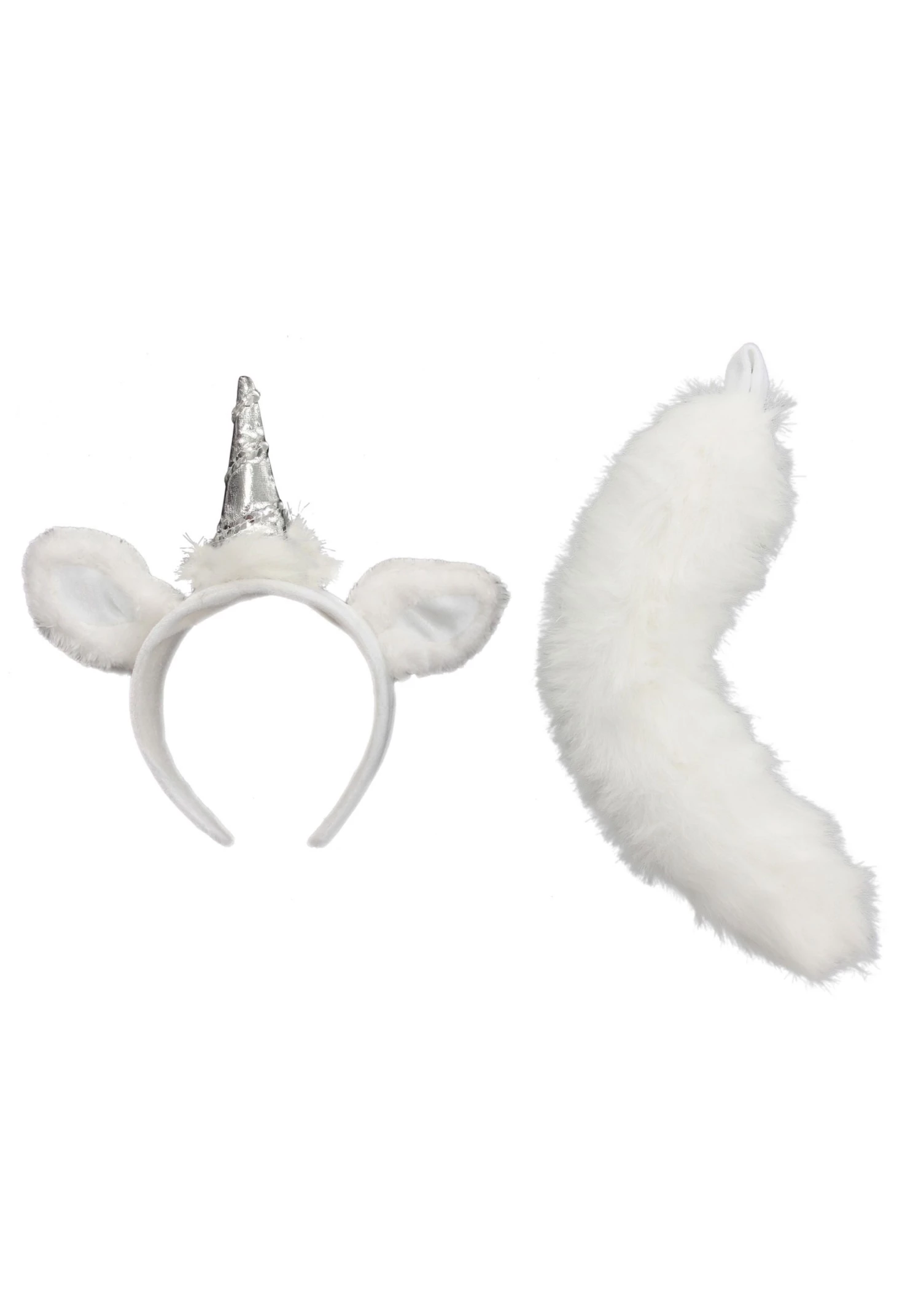 - White headband w/ stuffed white ears & a stuffed silver horn in the middle.