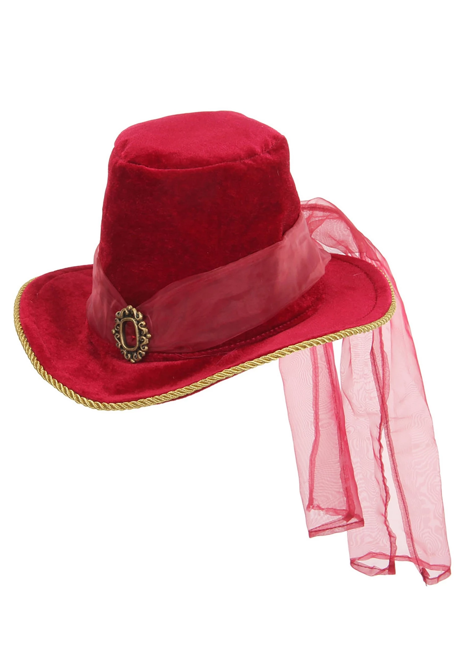 - Velvet hat has organza hat band anchored by plastic buckle at front