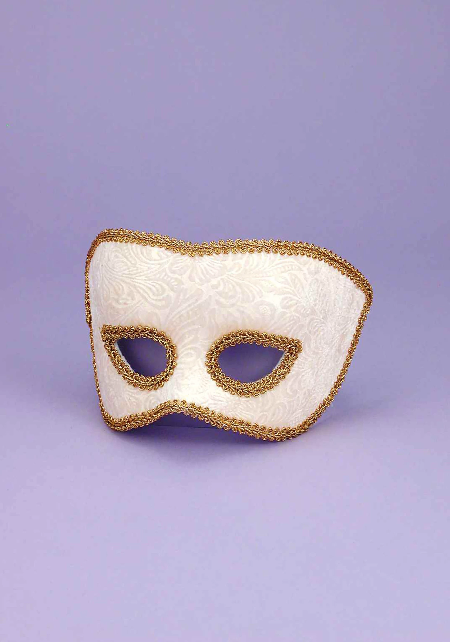 - Molded eye mask is textured tone-on-tone fabric edged w/ gold braid