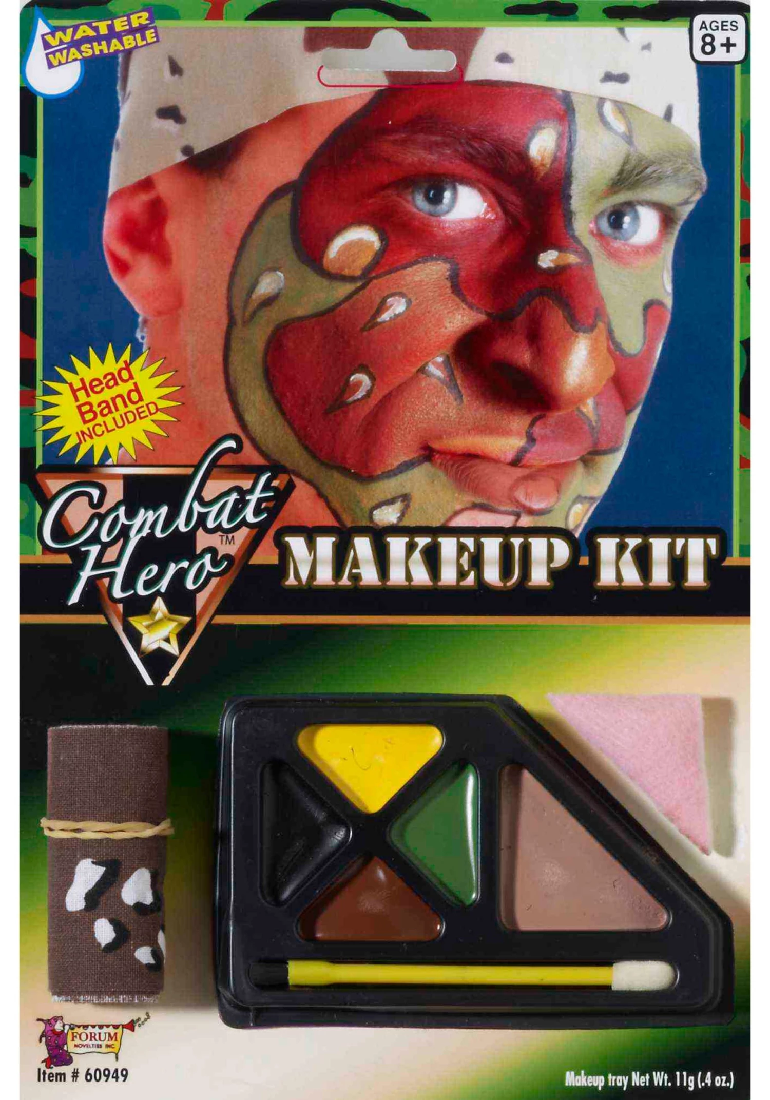 This accessory comes with everything you need in order to create a believable transformation. Use the sponge to make a camo pattern on your face. Outline that pattern in the black makeup with the included mini-brush. Fill in all the shapes you drew with the brown, dark green, bright yellow, and black face paint. We should note that this combat hero makeup kit also comes with a headband that will work with any costume.
