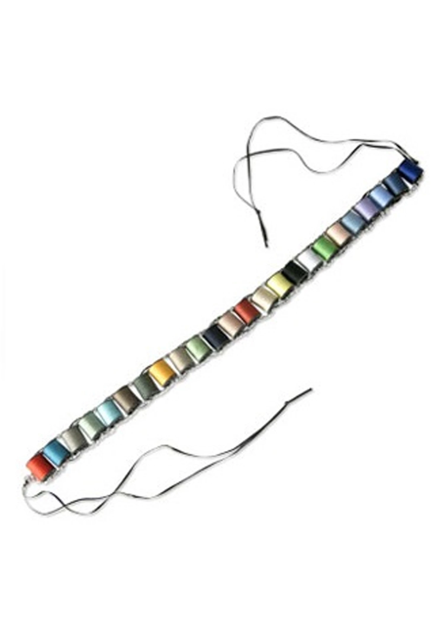 - Colorful spools of thread connected by a silver metal chain