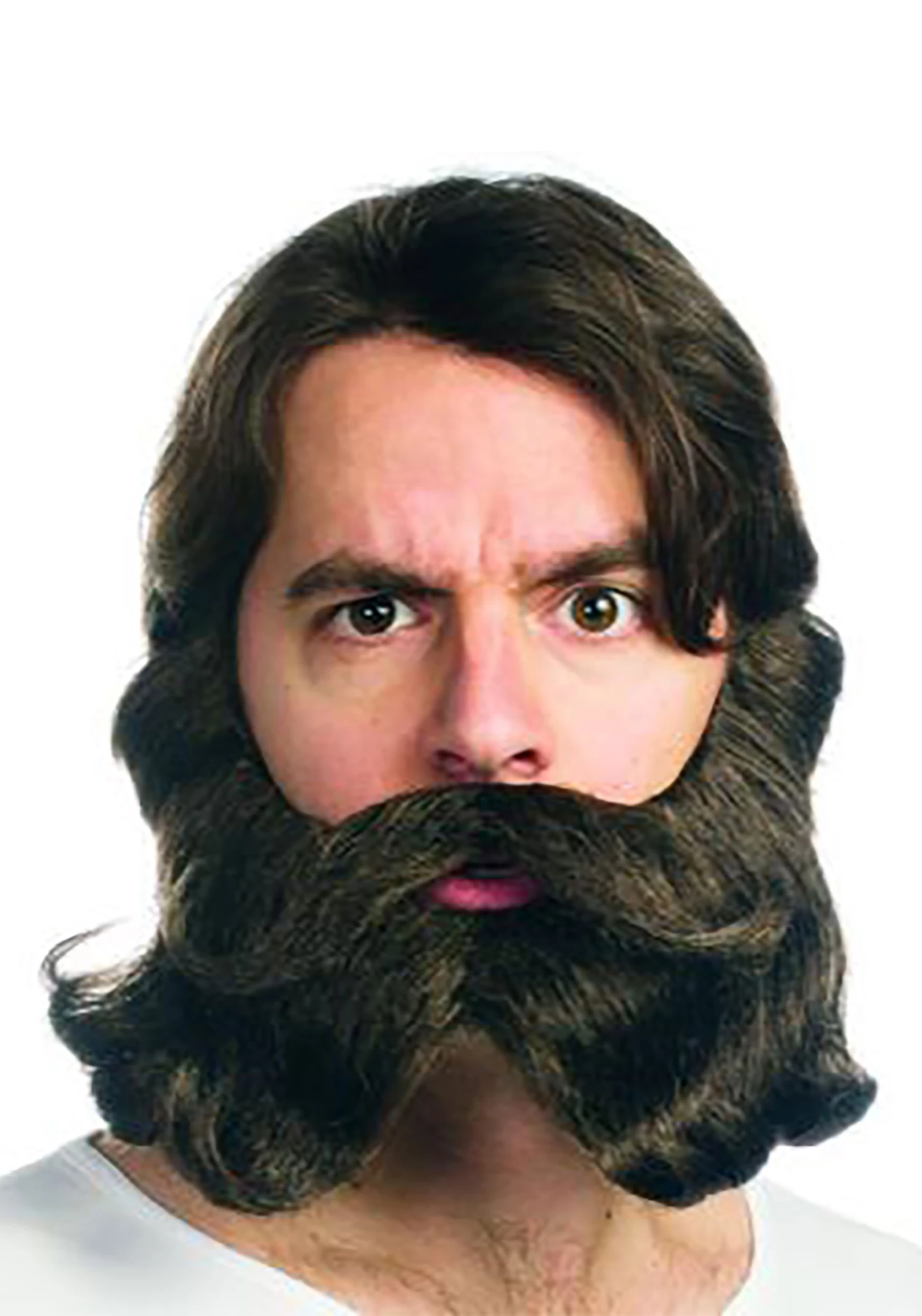 - Beard/mustache combo is synthetic hair on mesh backing