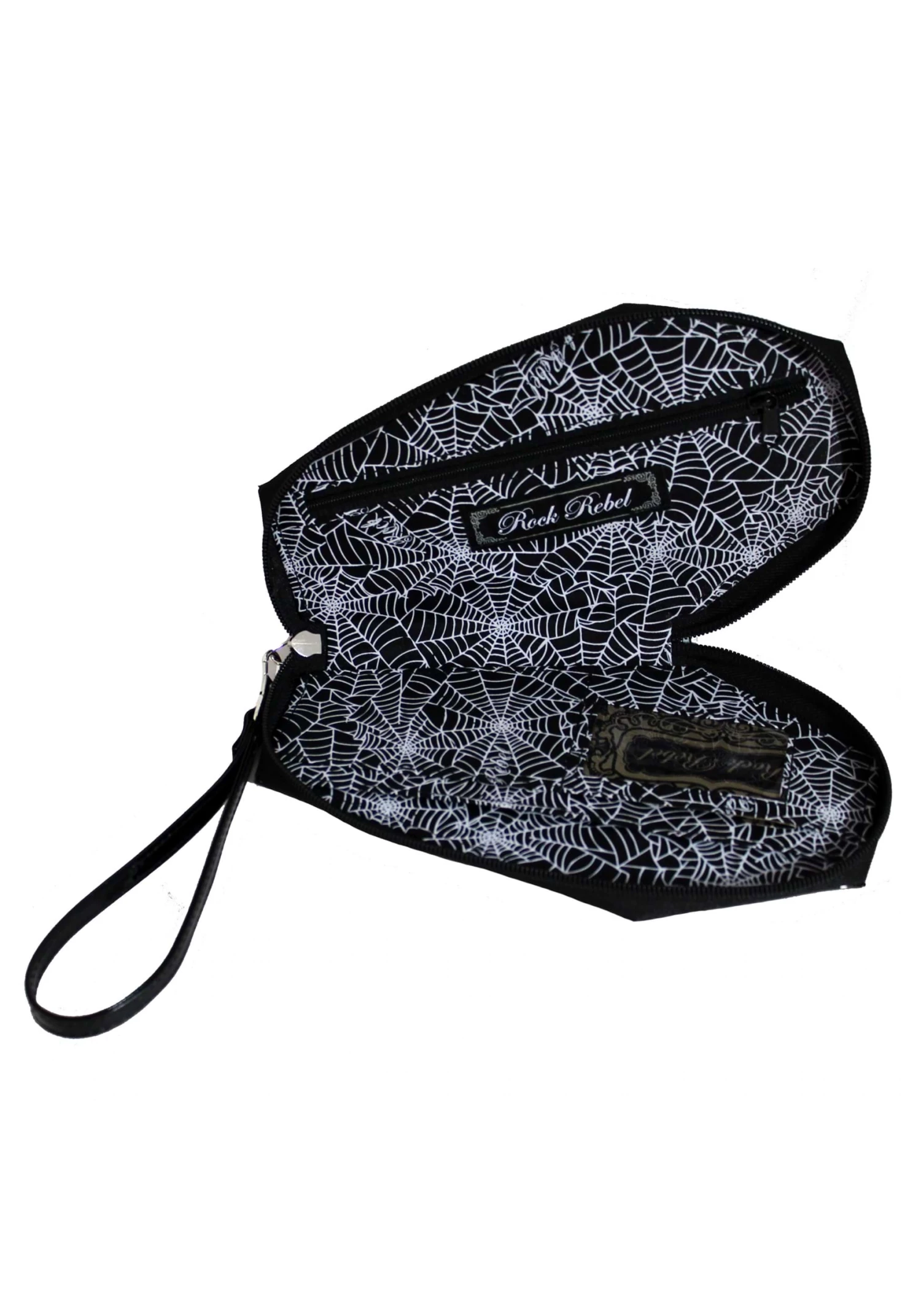 - Faux-patent-leather outer shell, spiderweb-printed fabric lining