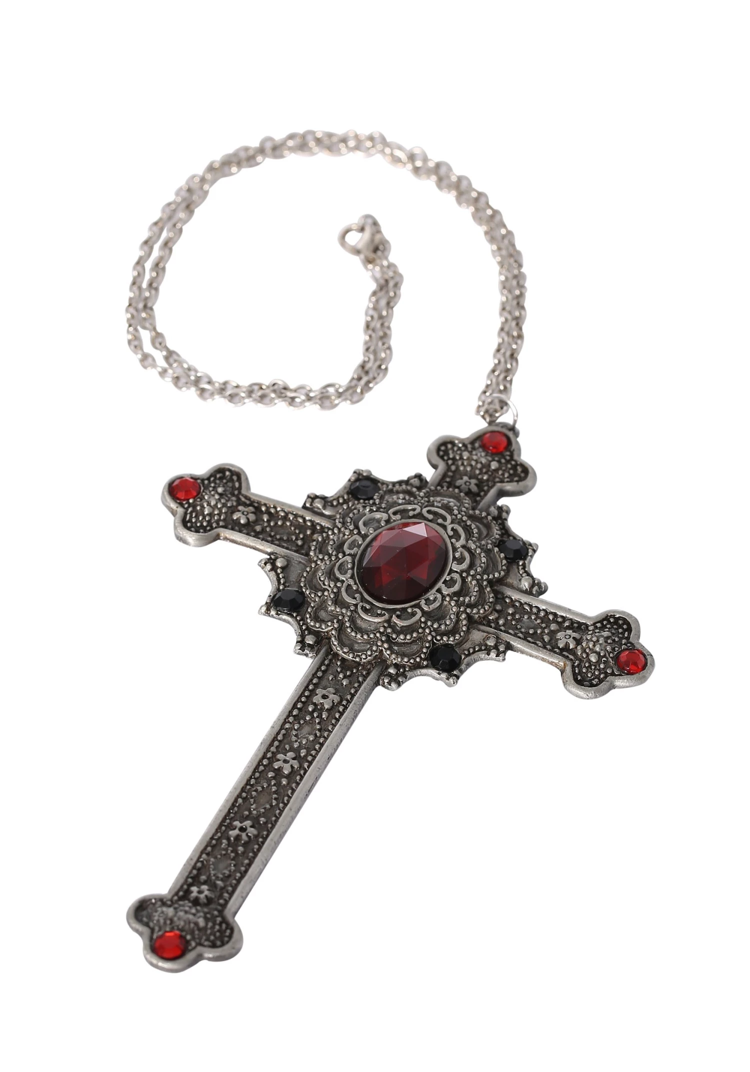Enhance all your mysterious mystique when you gear up with this Gothic Cross Necklace. Perfect for your vampire, nun, witch, or immortal look, this style is simply never going to go away! The necklace has a powerful metal look though is lighter than it seems. The bright faux red gem will have all thinking of the sacred blood while the long 21-inch chain lets you wear it as a long necklace, double up for a short look, or hold it out as a charm!