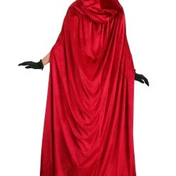 - Satin cape has black shell, red lining, stand-up collar w/ peaked edge