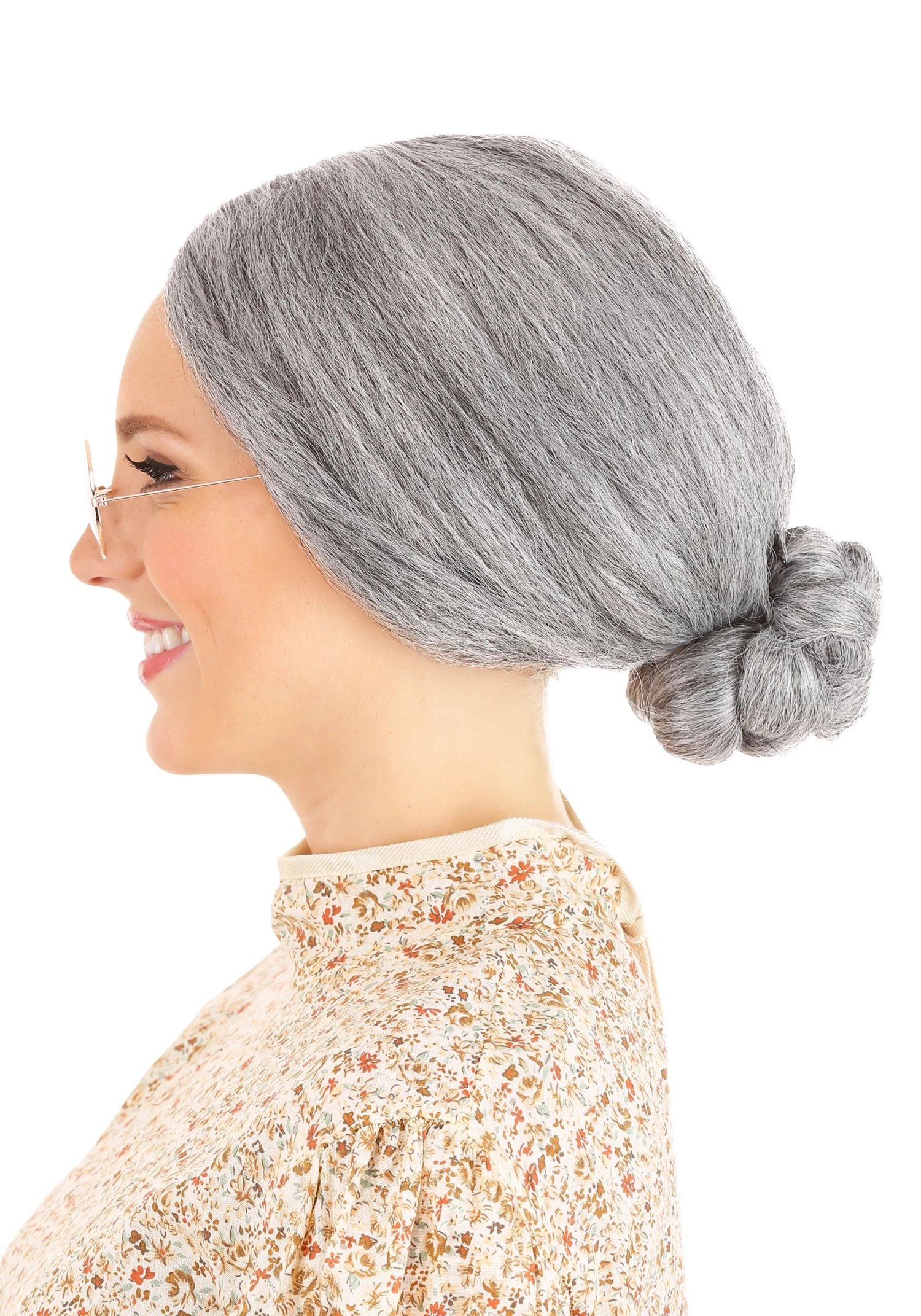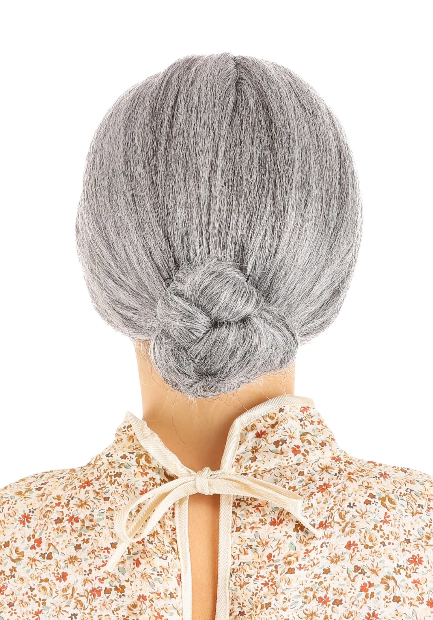 - Grey wig fashioned into a low bun
